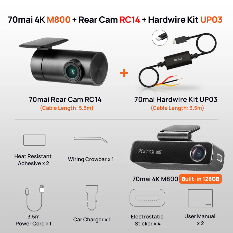 70mai Dash Cam 4K M800 2160P eMMC المدمج في 128GB GPS ADAS يدعم 24H وقوف السيارات الحرس 4G متوافق مع نسخة مطورة. من 70mai M500