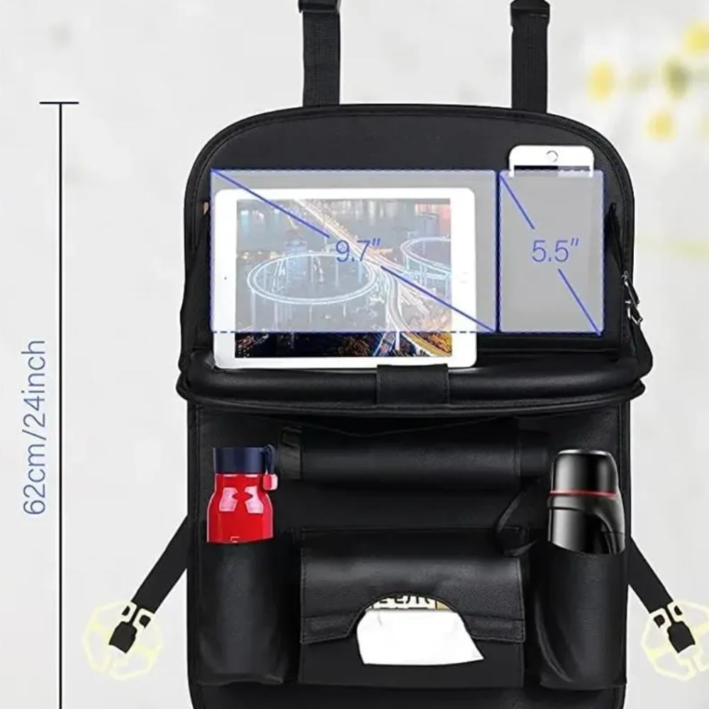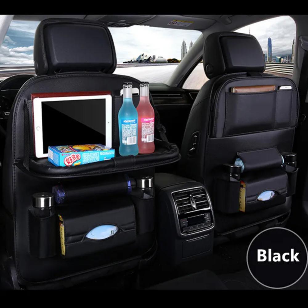 منظم خلفي لمقعد السيارة مع صينية طاولة قابلة للطي من جلد البولي يوريثان، منظم للتخزين، جيوب، سجادات ركل، ملحقات داخلية للمقعد